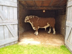 Sally Matthews’ ‘Hereford Bull’ in a cart shed at Cabalva Farm Gallery. Welded steel frame with bracken and feathers.